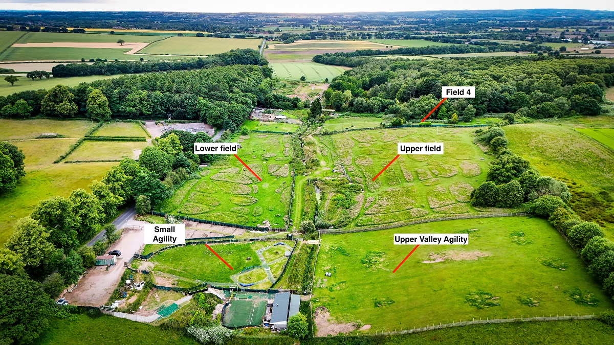 5 Acres split across two fields, with exercise areas and agility apparatus. A recently installed wooden bridge over a natural stream connects the two fields. On the 'upper valley' field you'll find a dedicated walkway, with rest area at the top of the field to give you a stunning view of the local landscape.